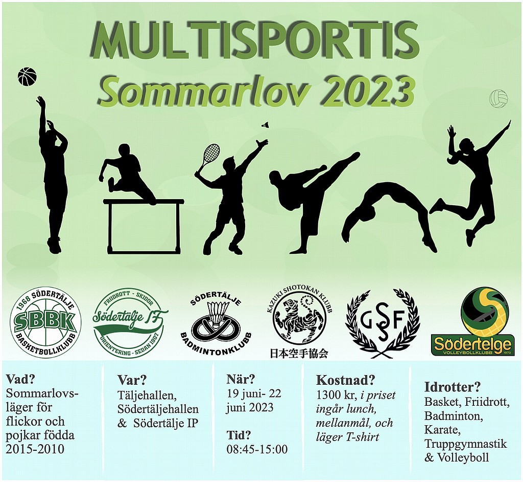 Anmälan är nu öppen för Multisportis 2023, säkra din plats innan platserna tar slut. I sommar har vi ökat med en timme för att kunna fylla dagarna med ännu mer idrott. Måndag till torsdag vecka 25 får du möjlighet att träna basket, volleyboll, karate, friidrott, truppgymnastik och badminton på ett och samma läger tillsammans med nya och gamla kompisar under ledning av engagerade och positiva ledare från de sex arrangörsföreningarna som under denna vecka går samman och gör detta läger möjligt.