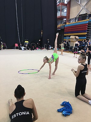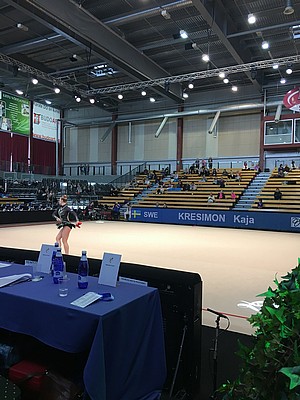 Vi flög dit tidigt på torsdag morgon och Tindra skulle tävla i grenen tunnband redan någon timme efter att vi anlänt till hallen i Tartu, hår och smink fick därmed fixas på flygbussen. Tindras första gren var lite nervös men hon klarade sig ändå med bravur med tanke på att det var hennes första tävling internationellt. Näst på tur var Kaja som också började med tunnband och hon körde ett ganska stabilt program men det märktes även på henne att det var lite nervöst första gången på en internationell tävling. Efter tävlingen var vi alla väldigt trötta och tog bussen till hotellet för middag, medan Anna stannade kvar med Uppsala för podiumträning.